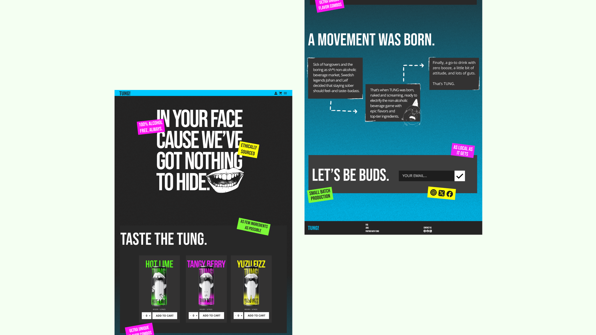 Tung is punk: tattoos, spiky hair, tongues out – and now, staying sober. Bold, rebellious, and unapologetically real, Tung is a non-alcoholic beverage that lets you rage all night and still rise like a badass the next morning.